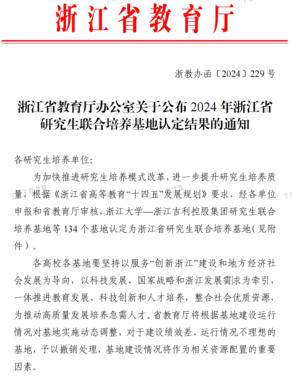 校园新闻网讯近日,浙江省教育厅公布了2024年浙江省研究生联合培养基地认定结果,我校宁波工程学院——浙江钰烯腐蚀控制股份有限公司研究生联合培养基地、宁波工程学院——镇海石化物流有限责任公司工程管理研究生联合培养基地被认定为省级研究生联合培养基地。本次申报面向省内具有硕士学位授予单位的高校,一共有134个基地通过认定。