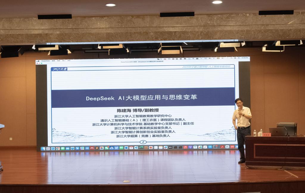 在专家辅导环节中,浙江大学计算机科学与技术学院基础教学中心副主任陈建海受邀作了题为《DeepSeek AI大模型应用与思维变革》的专题讲座。他以幽默诙谐的方式,深入浅出地介绍了人工智能大模型的应用如何落地并赋能数字经济高质量发展。陈建海指出,人工智能是未来时代的重要新生力量,正带来产业新机遇与挑战,推动深刻的思想变革,面对这一趋势,教育工作者应积极更新教育理念,主动适应技术变革,将人工智能思维融入教学实践,以培养更具创新能力和适应未来社会发展的优秀人才。