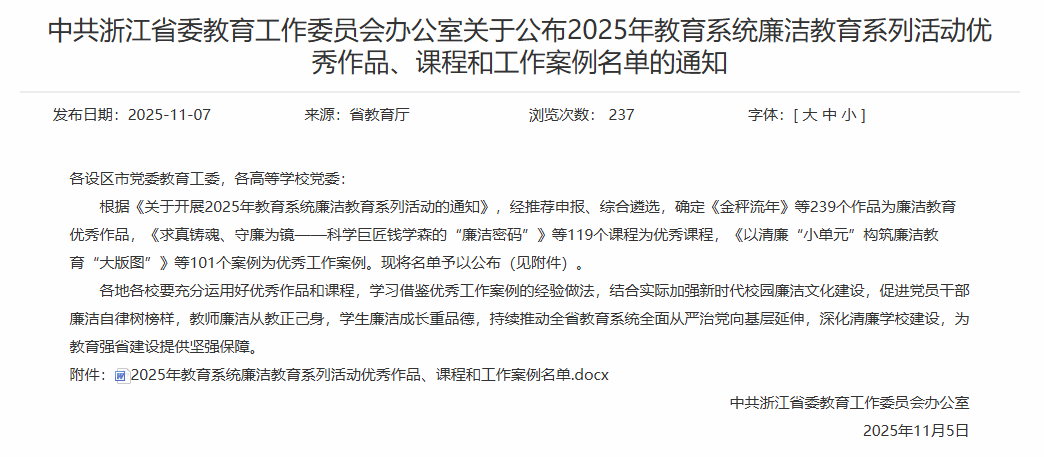 校园新闻网讯 近日,浙江省委教育工委公布2025年教育系统廉洁教育系列活动优秀作品、课程和工作案例名单,我校选送的4件作品荣获奖项,其中2件作品被推荐至教育部参评,创历史最好成绩。