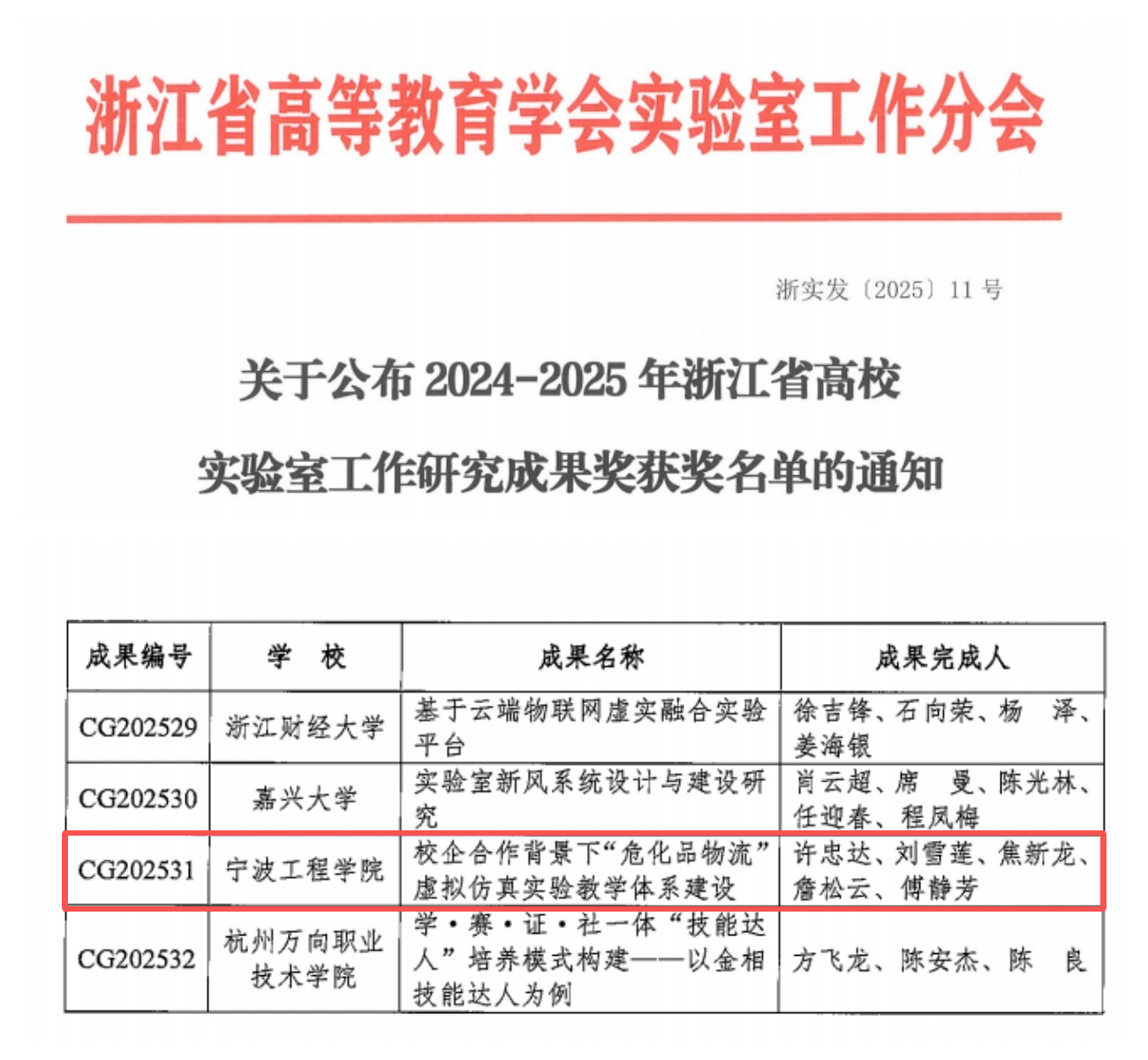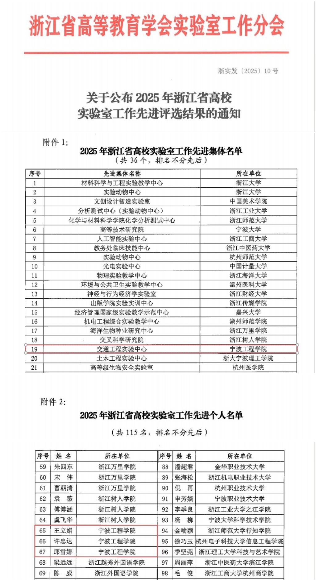校园新闻网讯 近日,浙江省高等教育学会实验室工作分会相继公布2025年浙江省高校实验室先进工作评选和2024-2025年浙江省高校实验室工作研究成果奖,我校立足应用型办学定位,在两项评选中均斩获佳绩。其中,交通工程实验中心获高校实验室工作先进集体,王丽娟、许忠达、邱雪娜三人获高校实验室工作先进个人,“校企合作背景下‘危化品物流’虚拟仿真实验教学体系建设”获高校实验室工作研究成果奖。