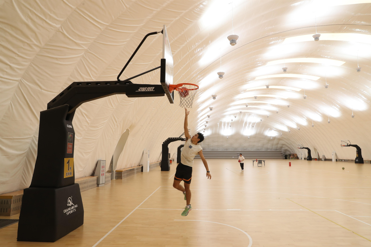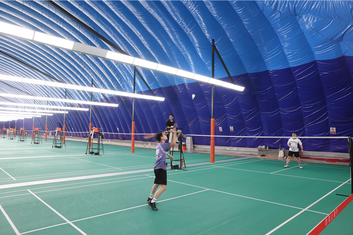 两个气膜馆中间,还有一个面积约1400平方米的综合馆,内设办公用房、乒乓球馆、健身力量馆、洗浴、卫生间等。
