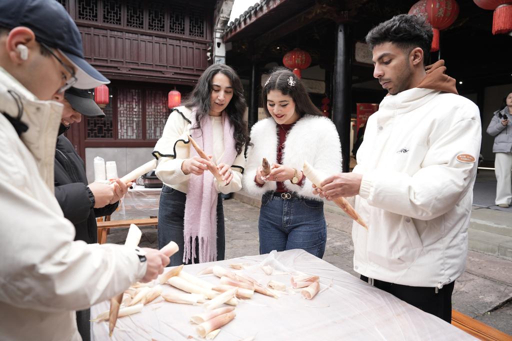 除年糕外,活动现场还准备了豆腐串、烤菜年糕、烤芋艿头、糯米团等奉化特色小吃。眼下正值奉化芋艿头的最佳品尝时节,刚上桌的烤芋艿头口感粉糯,很快便俘获了众多留学生的味蕾。“起初看它外表黑乎乎的,我还有点犹豫,没想到尝起来这么香!”来自乌兹别克斯坦的德领拿着一块芋艿头连连称赞。甜润软糯的糯米团同样深受留学生喜爱,“在也门,我们也非常喜爱甜食,这个味道让我想起了家乡。”也门留学生阿德告诉记者。活动现场丰富而新鲜的体验项目,也被留学生们用手机镜头一一记录。接下来,这些素材将被剪辑成短视频,分享到他们的个人社交平台。