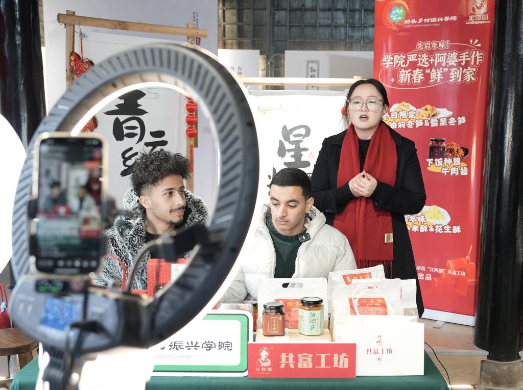 当天,青云村党群服务中心还邀请江阿婆共富工坊和滕头乡村振兴学院共同参与活动,通过现场直播带货的形式,让留学生感受中国乡村的振兴与发展。在带货主播的邀请下,留学生还做客直播间,为奉化特产“代言”。
