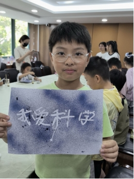 “大家知道火山是怎么喷发的吗?”志愿者一边提问一边在玻璃杯中注入纯净水,滴入的彩色色素并覆盖上食用油形成了天然的“岩层”界限。当泡腾片投入杯中,迅速与水反应产生的大量气泡裹挟着彩色“岩浆”冲破“岩层”,在杯中上演了一场微型“火山喷发”。孩子们屏息凝视,在惊叹中理解了气体膨胀与密度差异的科学原理,现场不时响起欢呼与掌声。在“维C密信”实验互动中,孩子们在纸上随心创作,或写下祝福或绘制图案。当碘酒喷雾均匀喷洒在纸上,原本空白的纸面逐渐浮现出清晰的字迹与图案,孩子们兴奋地举起自己的作品互相展示,在趣味互动中悄然掌握了氧化还原反应的基本知识。