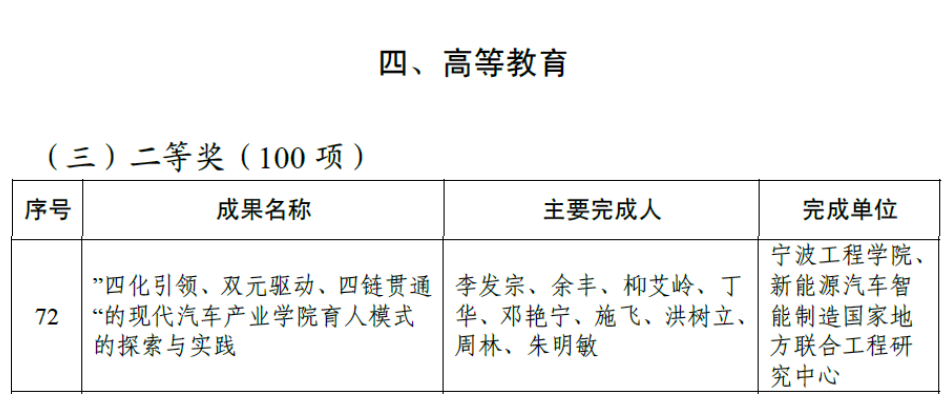 校园新闻网讯 近日,浙江省教育厅发布《关于公布2025年浙江省教书育人杰出贡献奖名单的通知》(浙教厅函[2025]204号),我院李发宗教授团队牵头完成的成果《“四化引领、双元驱动、四链贯通”的现代汽车产业学院育人模式的探索与实践》,成功斩获2025年浙江省高等教育教学成果奖二等奖。这是学院自2021 年首次荣获省级教学成果奖后,再次获此殊荣,为我院现代产业学院人才培养工作提供了坚实的成果支撑,也标志着学院在教育教学改革与实践领域的持续突破。