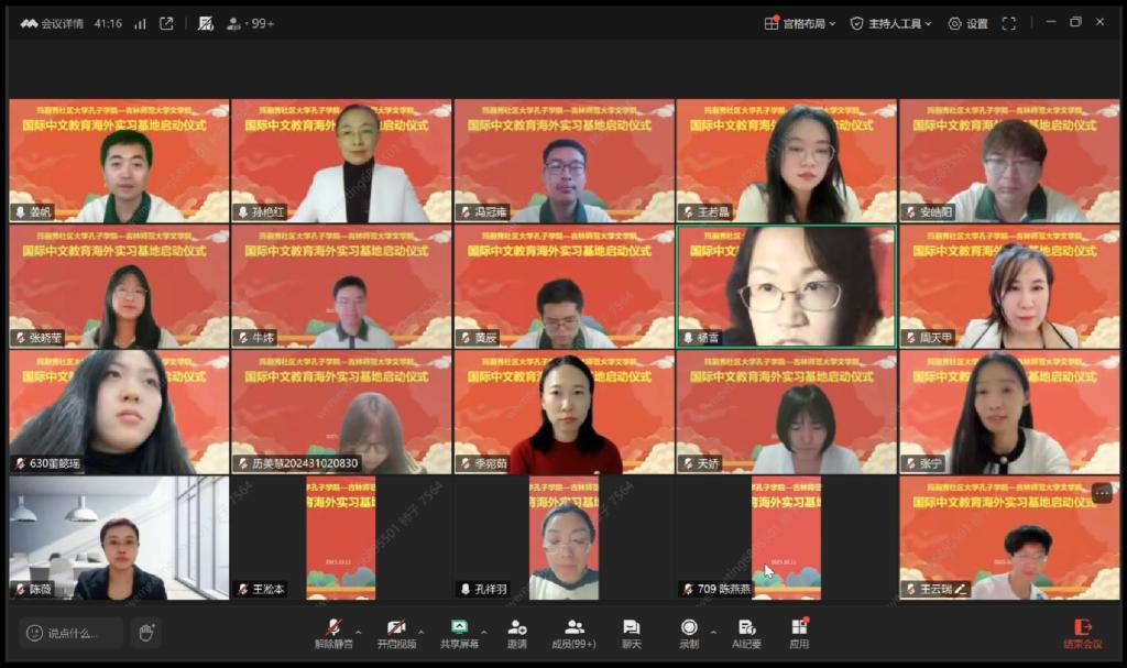 活动由吉林师范大学文学院副院长杨雪主持。她介绍了活动流程并宣布启动仪式正式开始。吉林师范大学文学院院长孙艳红在致辞中表示,国际中文教育是促进中外人文交流的重要纽带。此次海外实习基地的建立,是文学院深化产教融合、创新人才培养模式的重要举措。她希望通过双方的紧密合作,为青年学子搭建走向国际的舞台,让他们在海外实践中拓宽视野、提升能力,为讲好中国故事贡献青春力量。