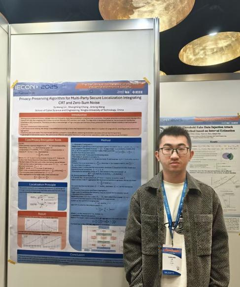 校园新闻网讯 近日,网络空间安全学院2023级网络工程专业本科生林孙康作为第一作者的论文《Privacy-Preserving Algorithm for Multi-Party Secure Localization Integrating CRT and Zero-Sum Noise》,已被第51届IEEE工业电子学会国际会议(IECON 2025)接收,并受邀于2025年10月14日至17日在西班牙马德里举行的会议上进行学术报告。