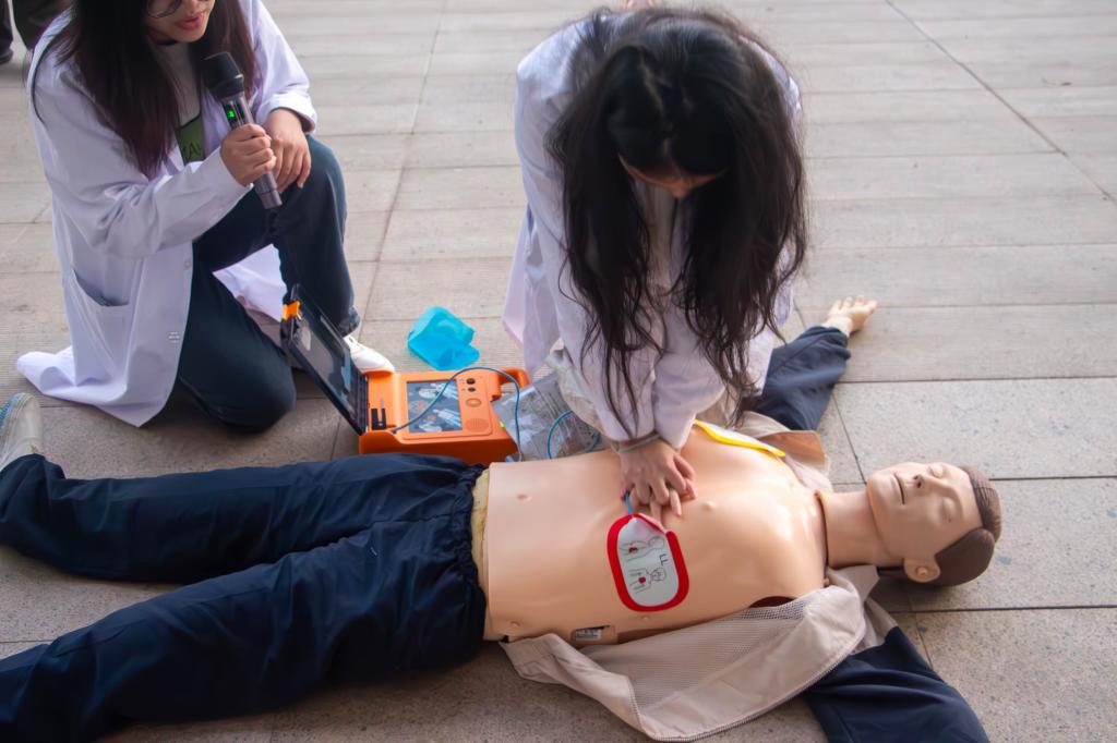 全体人员安全抵达风华广场指定区域后,计时停止,各区域负责人立即清点核对人数,并迅速将情况汇总上报。随后,现场开展了AED(自动体外除颤器)急救演示环节。校医人员向师生讲解了AED的使用方法及心肺复苏基本流程,并邀请部分同学参与模拟操作,提升了大家在紧急情况下的急救互救能力。
