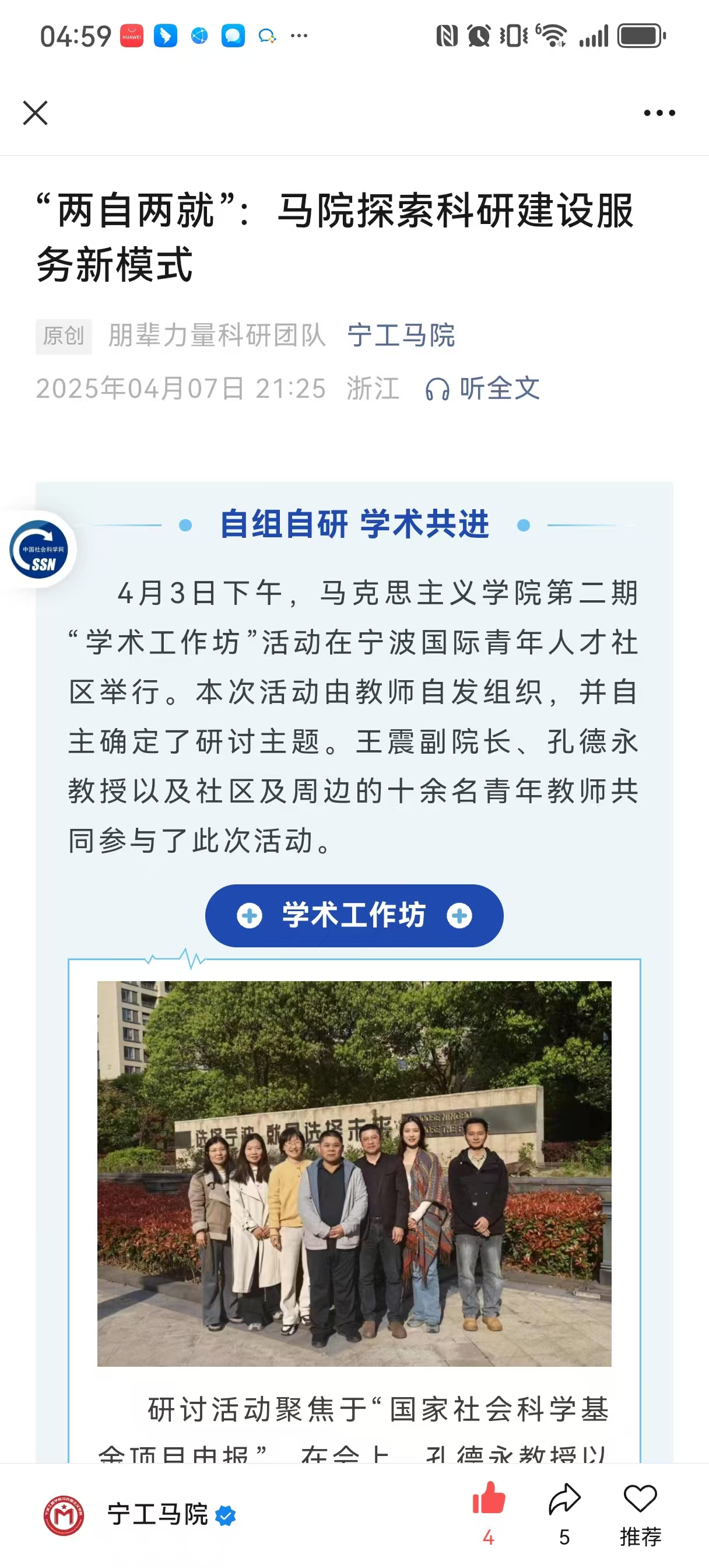 硕果盈枝的背后,是学院科研培育体系的持续发力。近年来,马克思主义学院始终将科研能力建设作为核心战略,通过“三维发力”激活科研内生动力:一是“抓两头、促梯队”,既发挥资深教授“传帮带”作用,传承严谨学术作风与前沿研究方法;又聚焦“青椒”群体成长,通过专题培训、课题辅导等精准培育,构建老中青衔接有序的科研人才矩阵。二是“强团队、聚合力”,依据教师学科背景与研究方向,组建专项研究团队,以科研骨干为核心开展联合攻关、协同申报,实现“1+1>2”的优势叠加效应。三是“建平台、搭载体”,常态化运行院级与基地(教研室)级“两级学术工作坊”,给予专项经费保障支持自主开展学术研讨,极大提升了科研活动的针对性与实效性。
