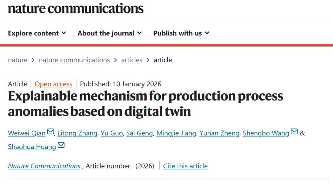 校园新闻网讯 近日,机器人学院青年教师钱伟伟联合南京航空航天大学、英国布里斯托大学等高校学者,在智能制造领域取得重要研究进展。相关成果以《Explainable mechanism for production process anomalies based on digital twin》为题,于2026年1月10日发表在国际学术期刊《Nature Communications》(自然·通讯)。
