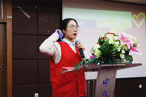 秦红波老师首先上台分享她的志愿故事。她说,志愿是爱的回馈,她曾经为一个生重病的孩子发起过募捐,后来这个孩子回报她的恩情;志愿是自我的提升,她从公司的普通职工升到了现在的总管,从初中的文凭到成人教育考试中取得高分。她表示是志愿的公益性让爱更加美好,不忘初心。