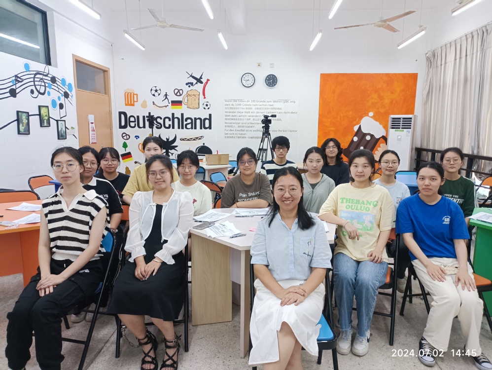 她不仅是知识的传授者,更是学生成长路上的引路人,以扎实的专业素养和炽热的教育情怀,书写着属于教育者的动人篇章。2008年,俞丽艳站上讲台,从此便将全部热忱倾注于德语教学。从基础的《德语视听说I-IV》《测试训练》到高年级的《经济德语》《经贸应用文写作》,她主讲的多门课程覆盖了德语学习的全阶段。面对严谨复杂的德语知识,她深知兴趣是最好的老师,于是大胆创新,独创“情境导入、多元输入、多途径输出”教学法。在她的课堂上,学生们不再是被动的知识接收者,而是化身中德论坛商务代表,用流利的德语进行谈判;分组制作德国国情文化海报,在合作中探索异国风情;拍摄主题微视频,将德语融入生活场景。这些充满创意的教学活动,让晦涩的语法知识变得鲜活有趣,学生们不仅掌握了扎实的语言技能,更在实践中锻炼了跨文化沟通与团队协作能力。教学中,俞丽艳始终牢记“立德树人”的使命。她巧妙地将“理解当代中国”教材中的内容与德语教学结合,用经济知识解读“中国关键词”。当学生们用德语探讨中国经济政策、文化特色时,不仅提升了语言运用能力,更培养了国际视野与家国情怀。